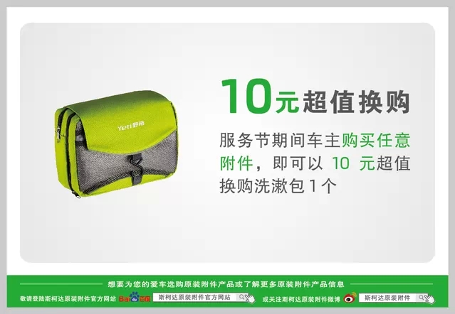 2014斯柯達(dá)服務(wù)節(jié)正在火熱進(jìn)行中!4月20日至5月5日活動(dòng)期間,在斯柯達(dá)原裝附件在線商城購(gòu)買任意附件,只需10元即可超值換購(gòu)洗漱包一個(gè)。