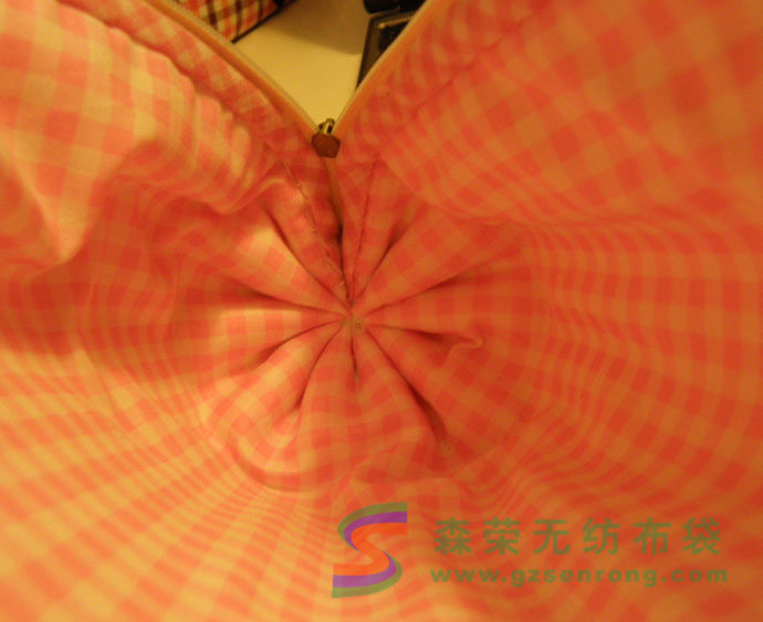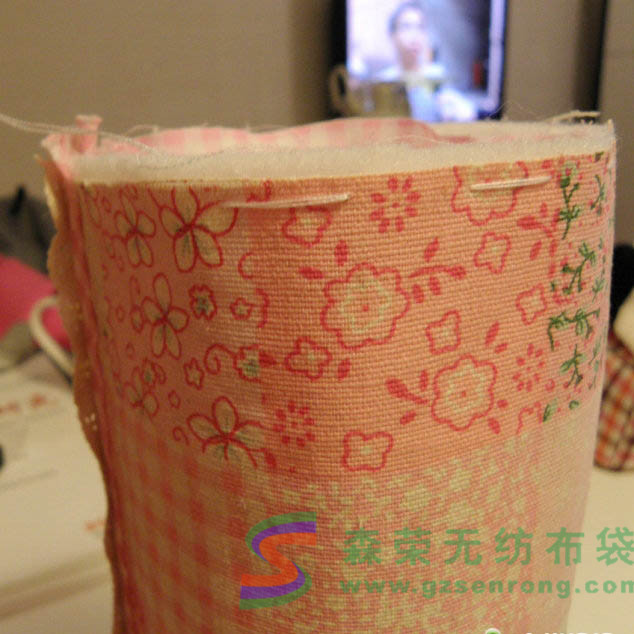 第二步,收緊兩頭做出圓筒狀。這一步看起來難,其實(shí)非常簡單。針穿透全部的表里布以及鋪棉,采用平針疏縫,但是間距要大,(如果間距太小拉緊的時(shí)候會(huì)比較吃力),而且間距注意要均勻(包型對(duì)稱漂亮就靠它了),如果不成功可以多試幾次。